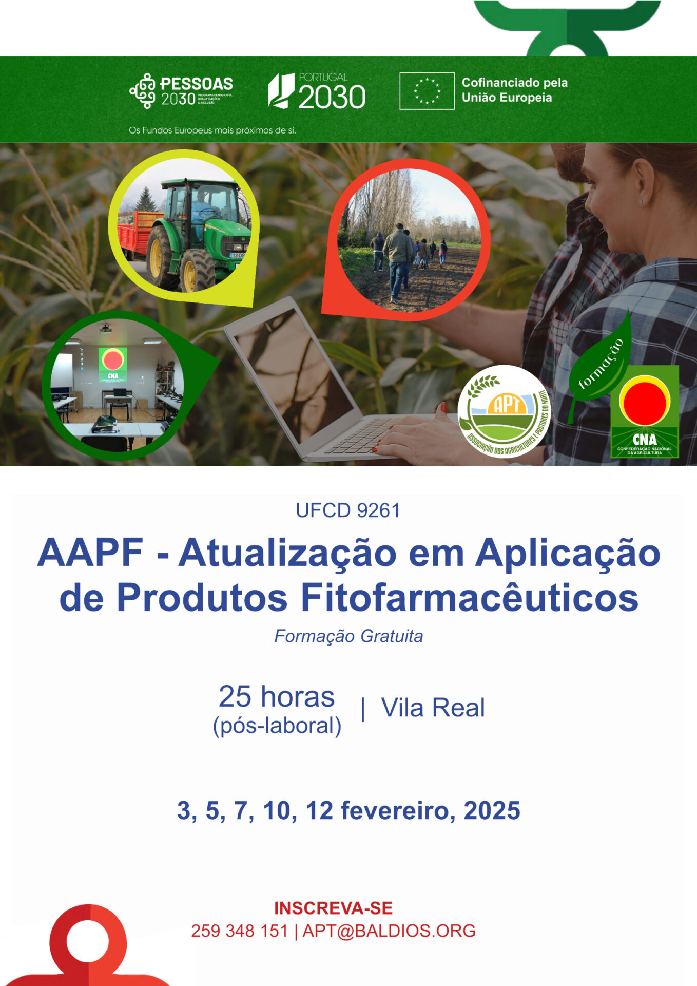 No âmbito do projeto PESSOAS2030, a CNA em conjunto com a APT, vai realizar uma nova ação de formação gratuita em Atualização em Aplicação de Produtos Fitofarmacêuticos (AAPF), destinada a todos os que já possuem formação inicial nesta área e pretendem renovar a sua certificação.